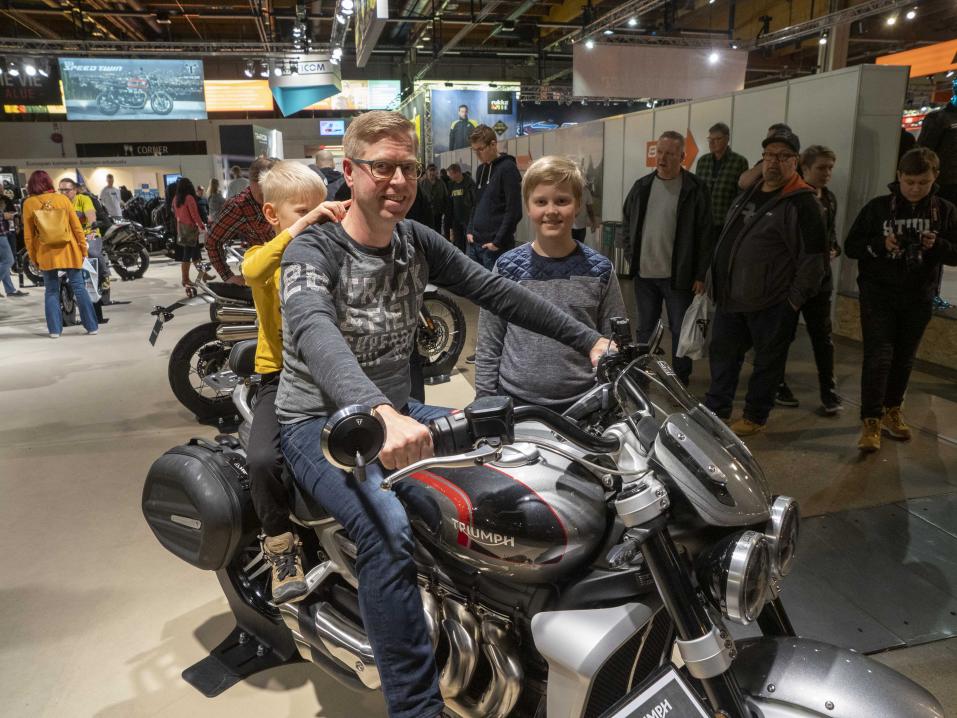 Triumphin osastolla Jarkko Huuhtanen istui fiilistellen Rocket 3 GT:n selkään. Isänsä kanssa fiilistelemään nousi perheen kuopus Reko Huuhtanen, isoveljensä Juran seuratessa vieressä.