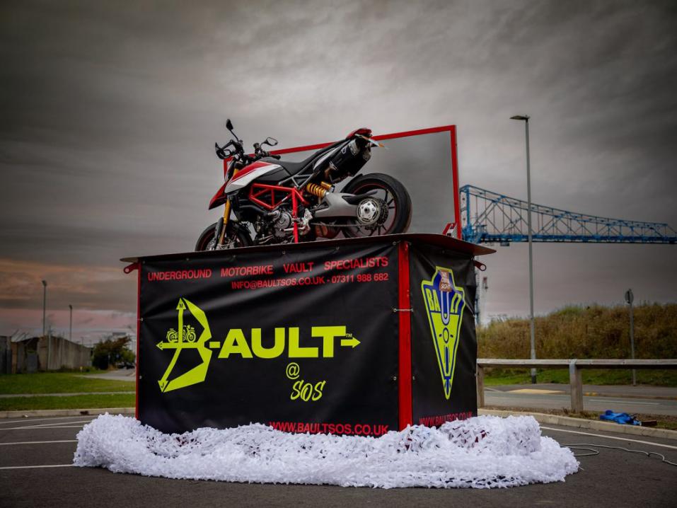 Bault@SOS-moottoripyörän säilytysjärjestelmä koostuu hissiratkaisusta, joka vie moottoripyöräsi maanalaiseen konttiin silloin, kun et sitä tarvitse. Napinpainallus, ja pyöräsi nousee maan alta tallisi lattialle. Joten siitä vain sitten ajamaan pyörällä tai huoltamaan sitä, tarpeesi mukaan.