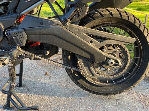 – Joustovarat ovat niin edessä kuin takanakin 191 mm. Kuulostaa vähältä adventurepyörään, mutta itse en havainnut jousituksen pohjaamista. Vaikka muutaman kerran sillä hyppäsinkin niin, että molemmat pyörät olivat ilmassa, totesi Anssi.