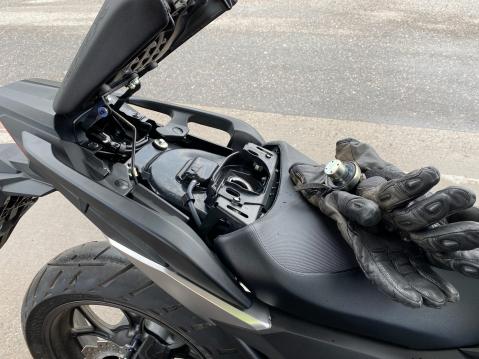 Honda NC 750 DCT:n normaalin polttoainetankin tilalla on tavaratila, joka talle vuodelle kasvoi litralla. Sinne mahtuu parhaimmillaan kypara.