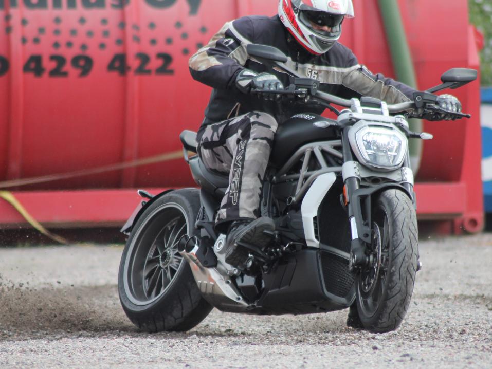 Ohjausgeometrialtaan ennakko-oletusta notkeampi XDiavel totteli hyvin käskyjä väistöjä testatessa. Ducatin ilmoittama 40 asteen kallistuskulma tuntuu riittävältä, huomioiden jalkatappien sijoitus ja tuntuma leveällä takarenkaalla. Vinkkinä XDiavel-hankintaa suunnittelevalle 182cm/100kg- kuljettaja ehdottaa ohjaustangon tuomista vielä lähemmäs kuljettajaa työntöohjauksen helpottamiseksi, kun äkkitilanteessa jalat työntävät etutapeilta kuljettajaa pystympään. Myös takaiskunvaimentimen perussäätöjä tiukemmat säädöt parantavat painavalla kuljettajalla ohjautuvuutta ja saattavat takapään toiminnan jämäkän keulan tasalle.