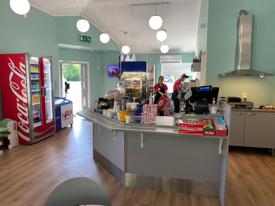 Jäätelökahvila Poutapäivässä on tarjolla pientä suolaista, paikallisia leivonnaisia, virvokkeita ja jäätelöannoksia yksittäisistä jäätelöpalloista näyttäviin jäätelöannoksiin. Voitilanjärven puolelta löytyy terassi, mutta helteisenä päivänä, jolloin paikalla kävimme, ilmastoitu sisätila tuntui houkuttelevammalta ratkaisulta.