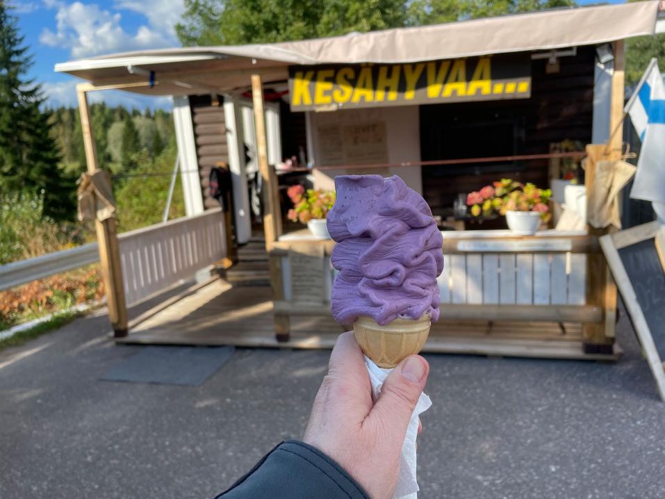 Pysähdyimme mustikkapehmikselle, mutta pelkästään pehmisvaihtoehtojahan löytyy huikeat 14 eri makua. Hinta 4,50 € voi kuulostaa paljolta, mutta jo pehmiksen koko (todella iso) ylittää suurimman osan peruskoosta ja pitää muistaa laadukkaat raaka-aineet. Mainoskylttien ulkonäkö on "rustiikkinen", mutta niiden ei kannata antaa hämätä.