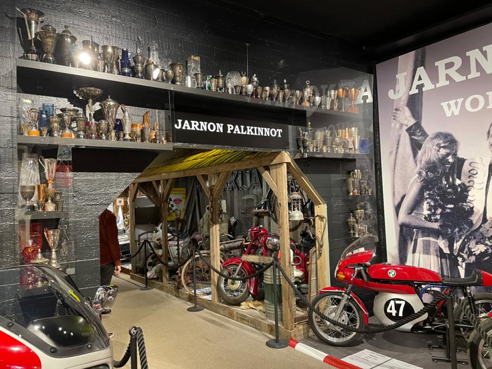 - Täällä on esillä paljon siihen Jarnon uraan liittyvää tavaraa. Muun muassa lähes hänen saamansa palkinnot, pyöriä, valokuvia, videoita ja muuta ennennäkemätöntä rekvisiittaa. Sen lisäksi museon osastoilla juhlistetaan sitä, että Imatran Moottorikerho täyttää 65 vuotta, Imatranajo 60 vuotta, Suomen Moottoriliitto 100 vuotta, Helsingin Moottorikerho 100 vuotta ja Touring Finlandia 50 vuotta.