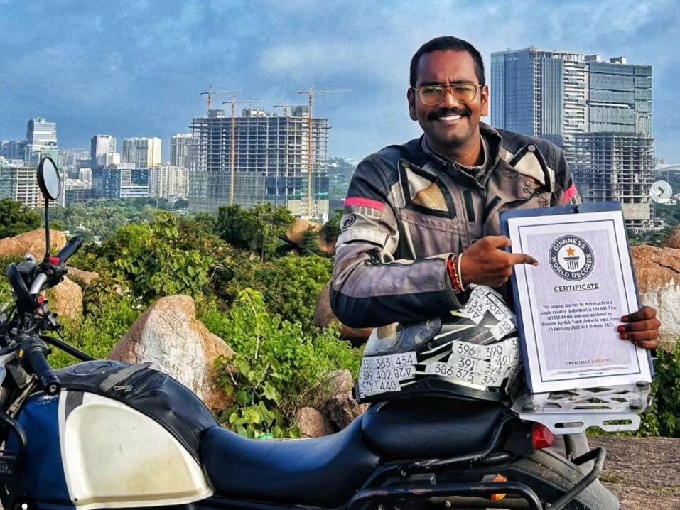 Intialainen moottoripyöräilijä Venkata Karthik Tupili onnistui yrityksessään rikkoa Guinnessin maailmanennätys ajettuaan pisimmän matkan moottoripyörällä yhdessä maassa. Tupili ajoi Royal Enfield Himalayanillaan 140 094,1 kilometriä 450 päivässä. Matka Intian halki oli poikkeuksellinen seikkailu ja henkilökohtainen voitto miehelle.