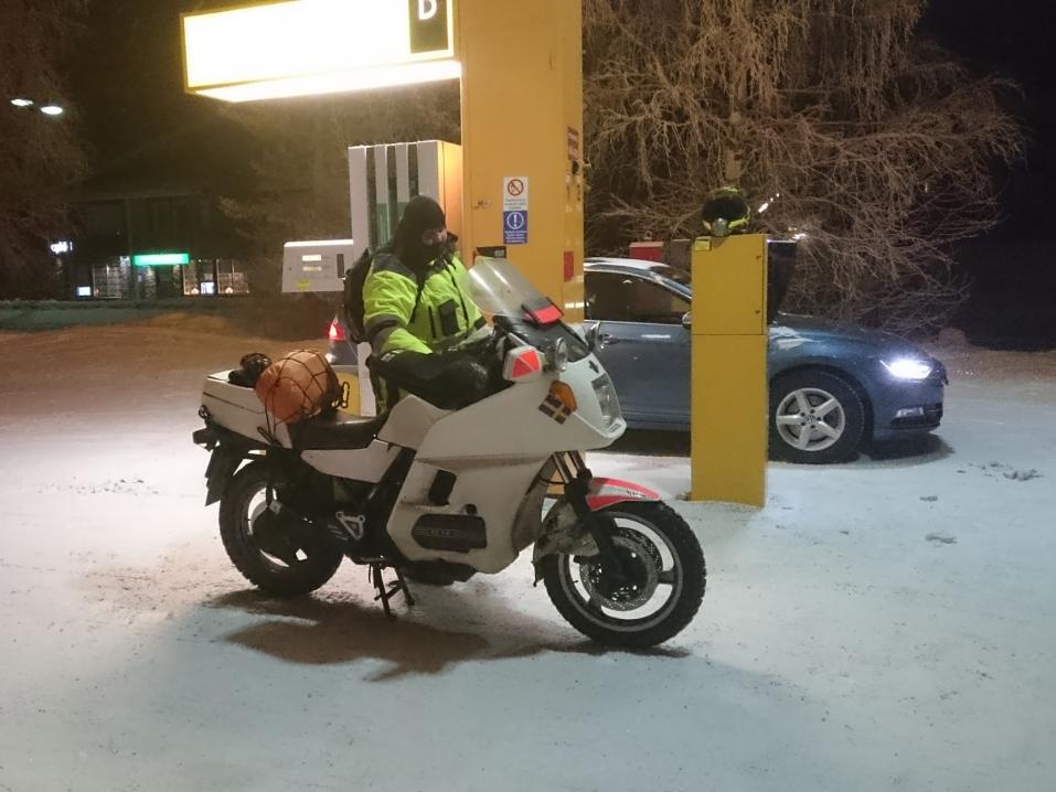 – Tauot venyvät pidemmiksi väkisinkin, kun on paksut varusteet päällä ja joutuu hanskat kädessä tankkaamaan, ja siihen päälle kaikki pukeminen ja riisuminen. Ideahan sinänsä on pähkähullu, mutta aina tällaiseen löytyy osallistujia. Toisaalta eihän tänne aloittelevia kuljettajia päästetä mukaan, vaan kaikilla pitää olla takana rauta-ahteriajoja ja lisäksi kokemusta talvimoottoripyöräilystä.