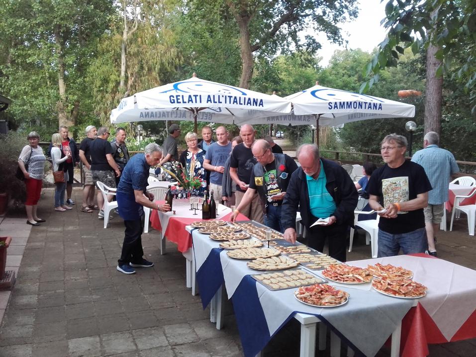 Lauantaina juhlavan illallisen jälkeen oli palkintojen jako. Kaikki osallistujat palkittiin muistoesineellä. Siinä on tuttu Ressu-hahmo, joka on otettu Moto Club Jarno Saarisen logoon. Lisäksi isännät muistivat Suomessa FINITAA järjestävää Kuopion moottoripyöräclubia KMC:tä kerhomme hyllyyn päätyvällä muistoesineellä. Ilta jatkui musiikin merkeissä.