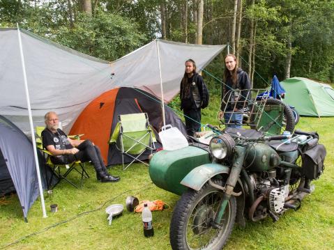 Huomio kiinnittyi alueen isoimpaan telttaan, jonka viereen oli viritetty nuotio. Ääreltä löytyivät Erkki Salminen Ylöjärvi LCR MC:stä, Tommi Virtanen Kyröskoskelta sekä Johanna ja Antti Raisio Hämeenkyröstä.