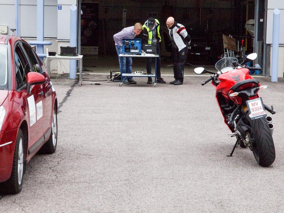 Näin päin laitteet vielä erottivat ajoneuvot toisistaan, mutta kun auto ajoi edellä, niin moottoripyörä katosi jokaisen mittalaitteen näkyviltä.