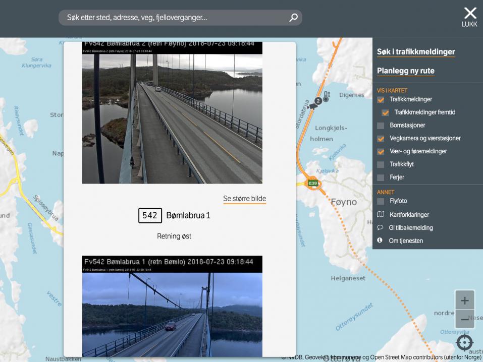 Norjan Vegvesenin Trafikkbetasta löytyy normaali tietyö- ja kelikamerapalvelujen lisäksi reittisuunnitteluominaisuus. Se on optio, josta varmasti on käyttäjälle hyötyä, kun se antaa myös vaihtoehtoiset reitit ja kertoo matkaan kuluvan ajan lisäksi tie- tai lauttamaksujen suuruuden.