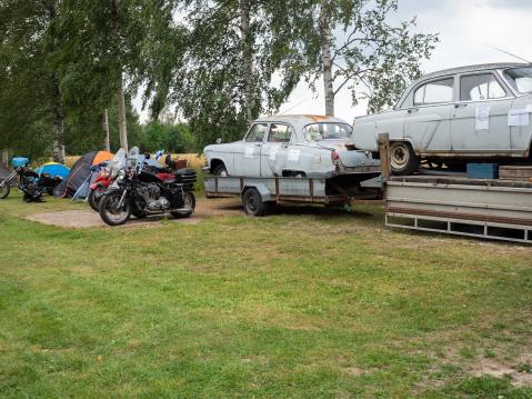 Joukko hajaantuu teltoilleen ja mökeilleen, joten sitten on aika lähteä katsomaan, mitä muuta alueella on tarjolla. Itäautoja on paljonkin, moottoripyöriä ei vielä ole tullut kovin paljon.