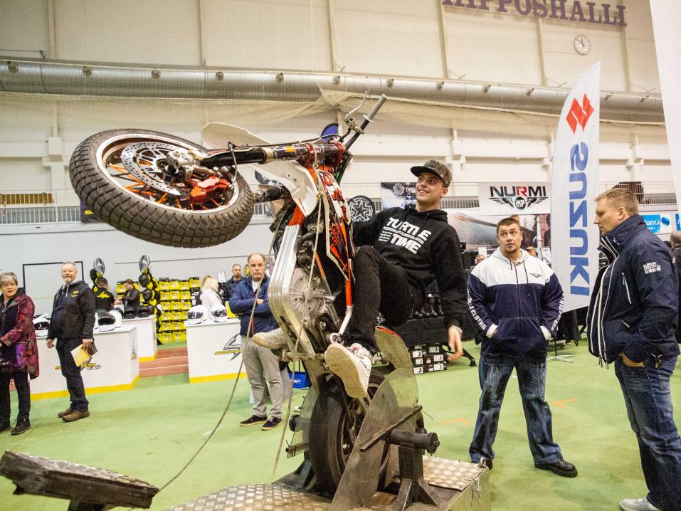 Kokeilunhaluisia näyttelyvieraita oli jonoksi asti. Seuraavana vuorossa oli Pekka Tommola. Joidenkin harjoitusyritysten jälkeen keula nousi vauhdilla ja turvanarut pitivät huolen, ettei pyörä kipannut nurin. Noustuaan pois keulintasimulaattorista miehen hymy oli herkässä.