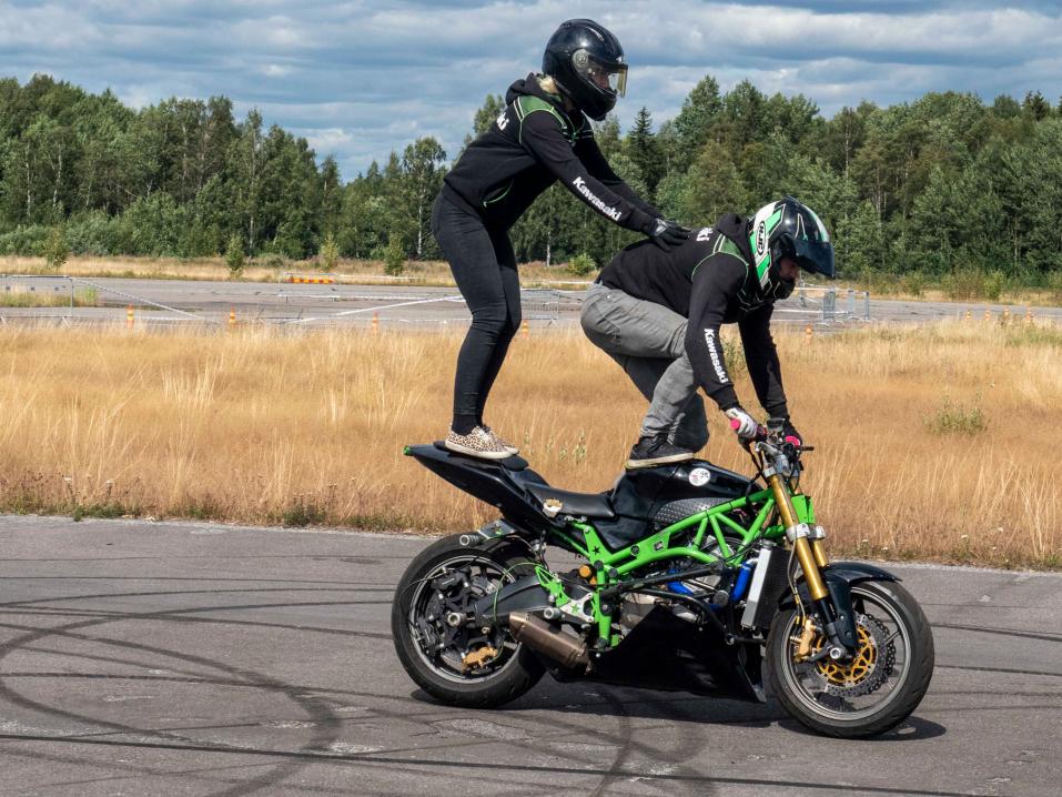 Hetken päästä kyytiin hyppäsikin nuori nainen ja ainakin allekirjoittanut pääsi ensimmäistä kertaa todistamaan tandem stunt show'ta. Kun moottoripyörällä stunttailu on muutenkin näyttävän (ja vaarallisen) näköistä, niin tässä noustiin aivan uudelle tasolle. Nähtiin hieno, Suomen ja todennäköisesti Euroopankin mittapuulla ainutlaatuinen show. Ainakaan YouTube:sta ei kovin montaa tandem-stunttaajaa löytynyt.