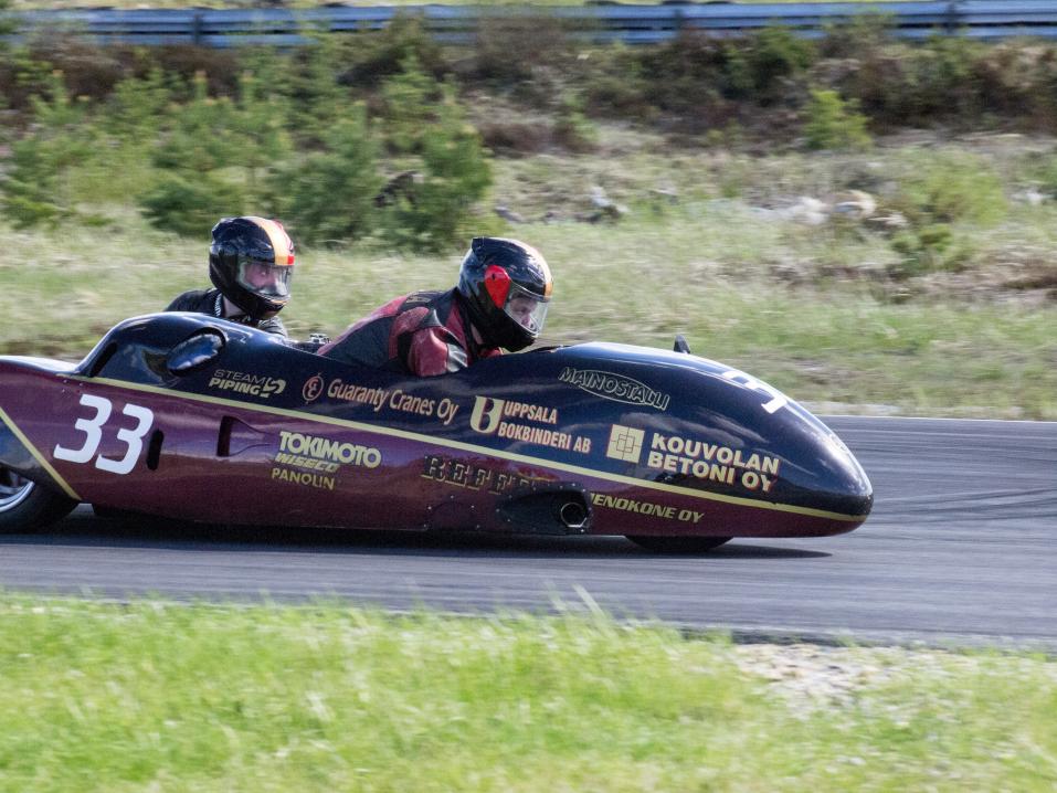 Kisan startti alkaa lähestyä. Pia lähtee auttamaan Artiolaa, kun taas Kari ja Matti kiinnittävät kuomun kisapyörään tarkistaen samalla, että pyörä on kisakunnossa. Karin kehotuksesta pääsen kokeilemaan, miltä tuntuu olla sivuvaunumoottoripyörän kuskin paikalla. Voin kertoa, että ajoasento on äkkiseltään todella outo. Ylimääräistä tilaa ei ole mihinkään suuntaan, mutta kokemuksena se on hauska ja mielenkiintoinen.