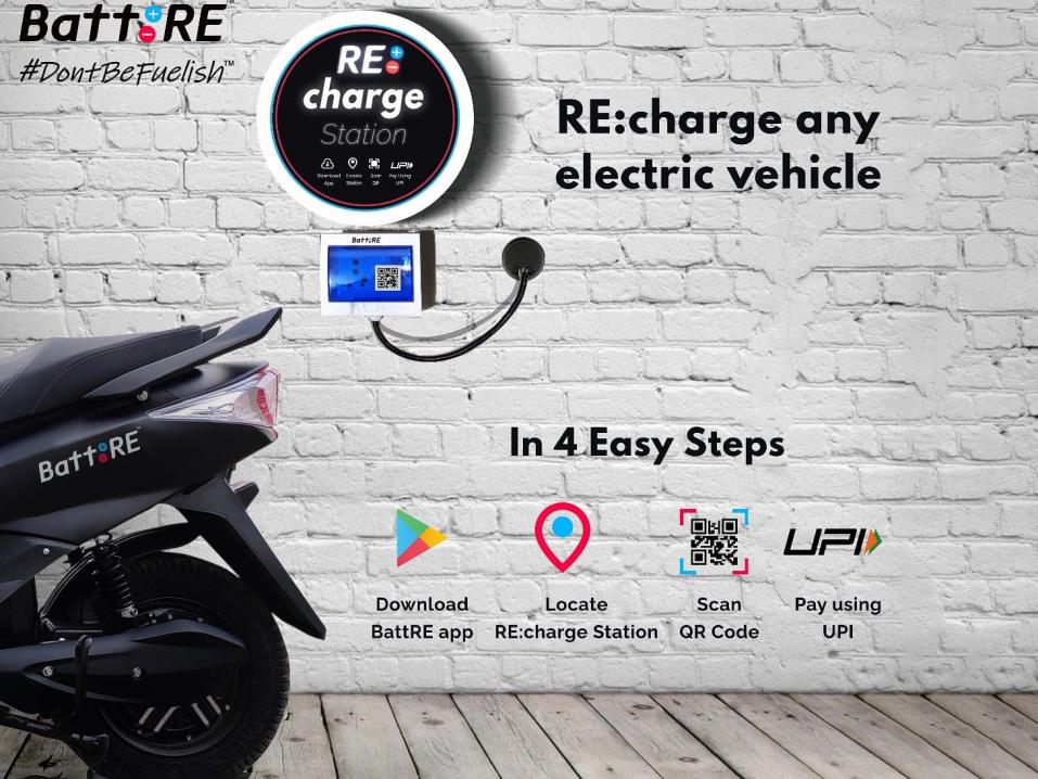 RE: Charge Station on vertaisverkkoon perustuva latausjärjestelmä, jonka yritys toivoo kasvavan ympäri Intian. Lähin latausasema on löydettävissä Android-puhelinsovelluksen avulla. Laturit toimivat minkä tahansa sähköajoneuvojen kanssa, ei pelkästään skoottereiden ja sähkömoottoripyörien kanssa. Kun saavut latausasemalle, skannaat vain sen QR-koodin puhelimellasi ja alat ladata. Maksun latausaseman haltijalle välittää UPI. Asemalla voi ladata vain yhtä ajoneuvoa kerrallaan.