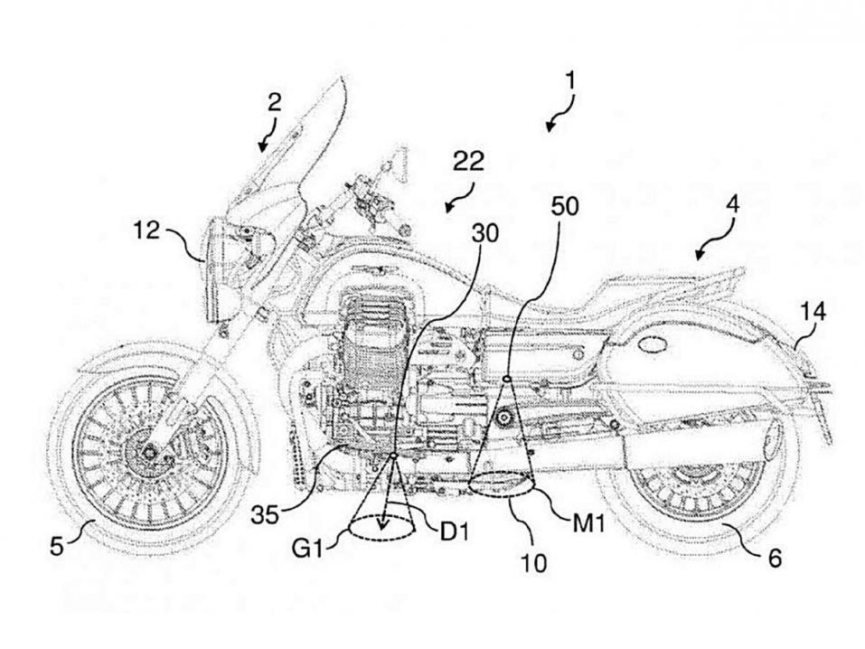 Piaggio Groupin järjestelmässä on ajoneuvojen luonteen erosta johtuen toisenlainen ote. Patenttikuvassa, jossa on Moto Guzzin matkapyörä, on kahdet alaspäin osoittavat valot. Ne ovat osoittamassa sekä kuskin että matkustajan jalkatapista alaspäin maahan.