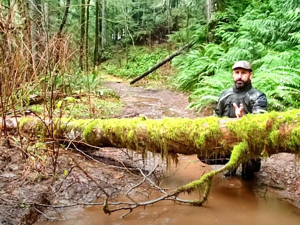 Videon alkuperäinen tarkoitus on näyttää, miten ylittää mutaisella tiellä oleva puunrunko. Tkacs esittelee paikan ja kertoo, miten aikoo sen tehdä ja kertoo myös riskit.