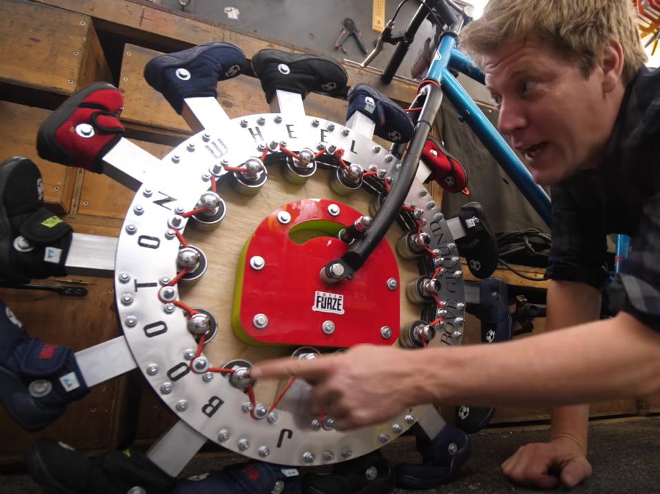 Pyörän mekanismi on Colin Furzen somekaverin käsialaa. Tämä teki pienikokoisen 3D-tulostetun mallineen asiasta, mutta Colin halusi testata, toimiiko kävelevä pyörä myös normaalikokoiseksi tehtynä niin, että siinä on ihmisen paino päällä.