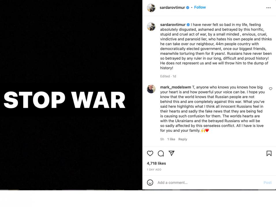 Kuten tämän jutun aloituskuvana olevasta instagram-viestistä näette, Sardarov suhtautuu erittäin jyrkästi tapahtuneeseen ja Putiniin leimaten hänet "pienimieliseksi, kateelliseksi ja julmaksi ihmiseksi" tämän käynnistettyä raa'an sodan Ukrainan kanssa.