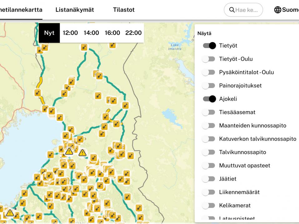 Fintrafficin Liikennetilanne-karttasivulta löytyvät meneillään olevat tietyöt ympäri Suomen. Palvelu on reaaliaikainen, ja sen antamaa tietosisältöä voit räätälöidä tarpeittesi mukaan. Sen avulla voit nopeuttaa lomamatkasi etenemistä ja välttää ruuhkat ja tietyöt.