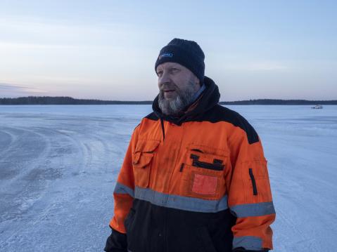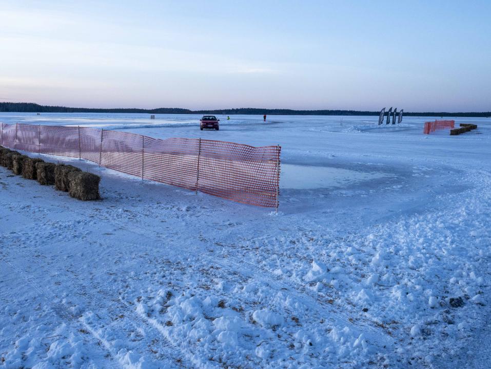 – Juuri sen verran on ollut pakkasta, ja tuuli on vielä vahvistanut sen vaikutusta, että järven jää on hyvässä kunnossa ja päälle sulanut vesikin on jäätynyt. Lisäksi lunta on tullut juuri sen verran, että rata on pystytty merkkaamaan auraamalla reitti jäähän. Kovin isoja penkkoja ei radan reunalla ole, mutta katsomon osa on eristetty joustavalla turvaverkolla, samoin varikkopuoli.