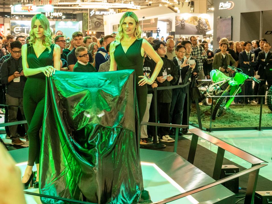 Hetki ennen tiedotustilaisuuden alkua Kawasakin osasto EICMA-messuilla oli autiotakin autiompi. Muutama minuutti, ja tungos oli melkoinen.