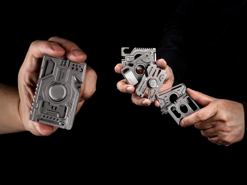 Kun kaikki viisi korttia on liitetty toisiinsa, työkalun kokonaispaino on 125 grammaa. Luokan 5 titaanista työstetyt kortit on valmistettu CNC-koneistamalla ja järjestetty teemoittain.