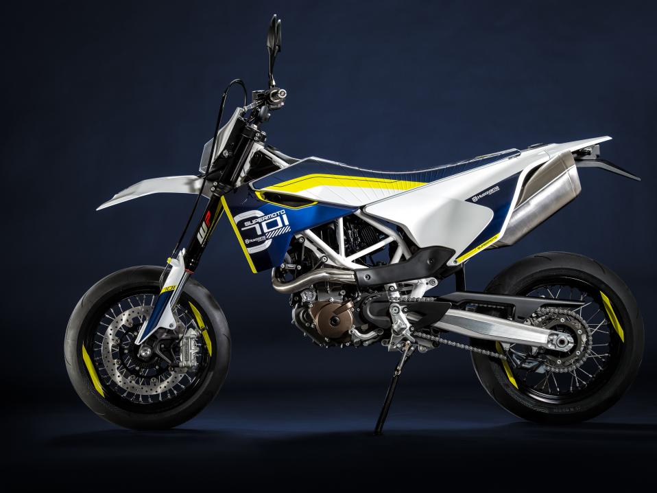 Uusi nyt julkistettu tuotantomalli on nimeltään 701 Supermoto. Lisäksi Husqvarna esitteli kaksi konseptia, 401 Vitpilenin ja 401 Svartpilenin. tämän jutun aloituskuvassa on Husqvarna 701 Supermoto, joka on hyvin puhdaslinjaisen näköinen.