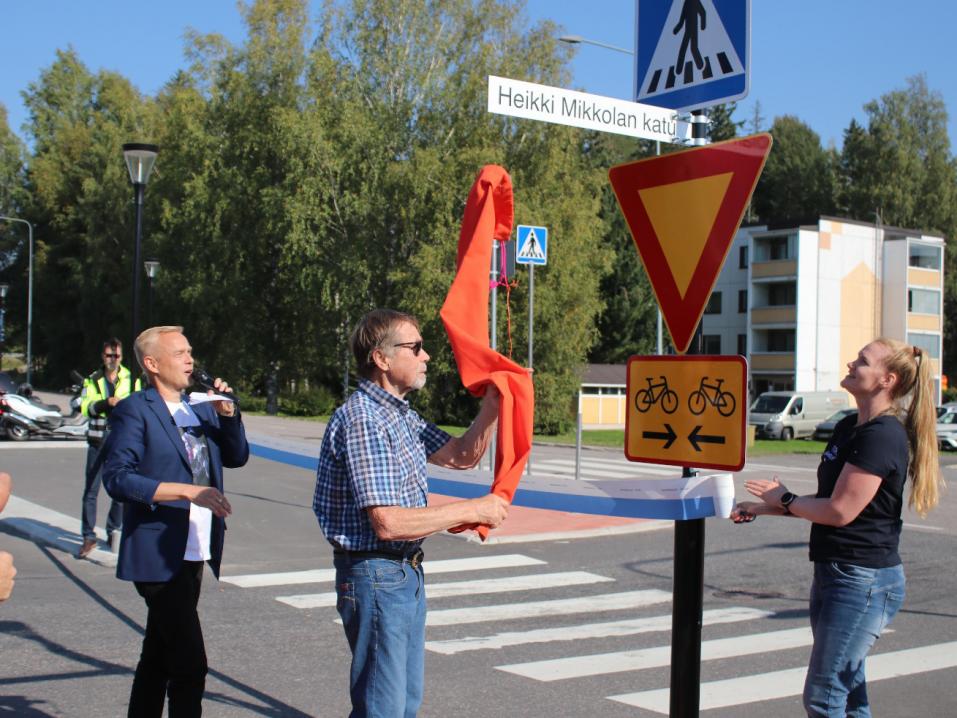 Heikki Mikkolan kadun avajaisissa paikalla kansanedustaja Timo Heinonen, kunniavieras Heikki Mikkola läheisineen, Suomen Moottoriliiton pääsihteeri Ville Salonen ja Lopen kunnanjohtaja Mikko Salmela.