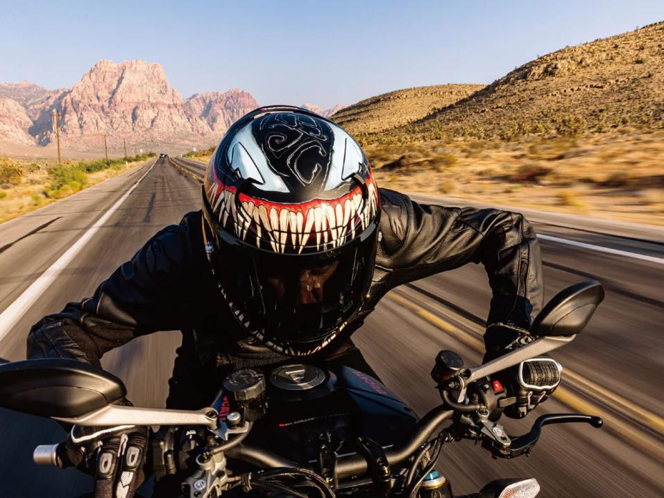 HJC on julkaissut aiemmin muitakin Venom-kypärämalleja, mutta RPHA 12 Venom 3 edition on toistaiseksi paras, sillä sen look on riittävän tummasävyinen ja lisäksi se on varustettu Venomin virnistyksellä ja partaveitsenterävällä purukalustolla, jota näytetään sekä visiirin ylä- että alapuolella. Venomin kieli laajenee kypärän sivulle, ja sitä korostaa pieni tippa sylkeä... Venomin hurjat silmät kruunaavat lookin ja korostavat hahmon ennalta-arvaamatonta luonnetta.