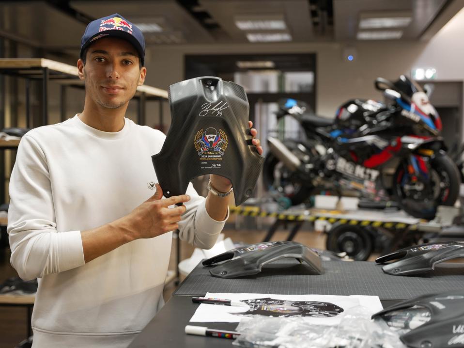 BMW M RR WSBK Champion Edition 2024 -malli ja Topak Razgatlioglu signeeraamassa numeroa 54.