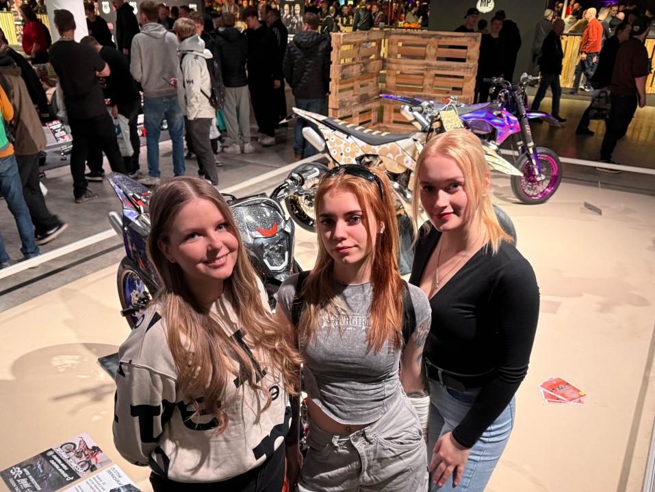 Mila Wikmanin KTM 300 EXC vm.2014, Ella Raitasen KTM 250 EXC vm.2019 ja Isadora Aholan KTM 250 EXC Six Days vm. 2018 olivat omalla ständillään. Sovimme tapaamisen pyörien luona ja vaikka Supermotojen ympärillä kävi kuhina, saimme hälinän keskellä haastattelut tehtyä.