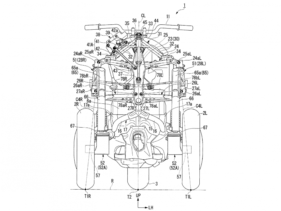 Japanin patenttihallituksen julkistamat piirrokset osoittavat, Honda on hakenut patenttia kolmipyöräiselle, jota voi kallistella. Hondan ratkaisussa tuplapyörät ovat edessä.