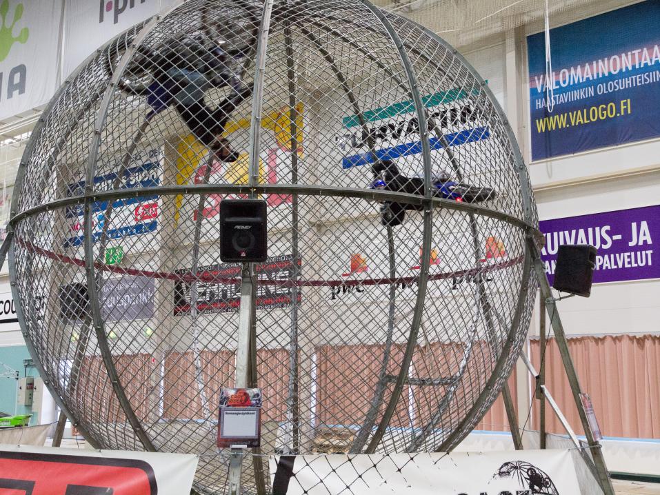Surmanajajiksi ei ole koskaan ollut tunkua varmaankin lajin vaarallisuuden ja vaativuuden tähden. Tällä hetkellä lajin ylvästä taitoa pääsee ihailemaan suomalaisessa Cage Riders Show:ssa, joka viikonlopuksi rantautui Seinäjoen Bike Show:hun. Cage Riders on käytännössä pitkän enduro-, bomber- ja stunt-uran tehnyt kaksikko Pasi "Hepe" Heikkilä ja Sasja Laajoki, jotka perjantaina pystyttivät massiivisen 6 metriä halkaisijaltaan ja 3000 kiloa painavan esiintymisareenansa. Tavoitimme heidät rakennustyön ollessa loppumetreillä ja he ehtivät pikaisesti vaihtaa muutaman sanan kanssamme.
