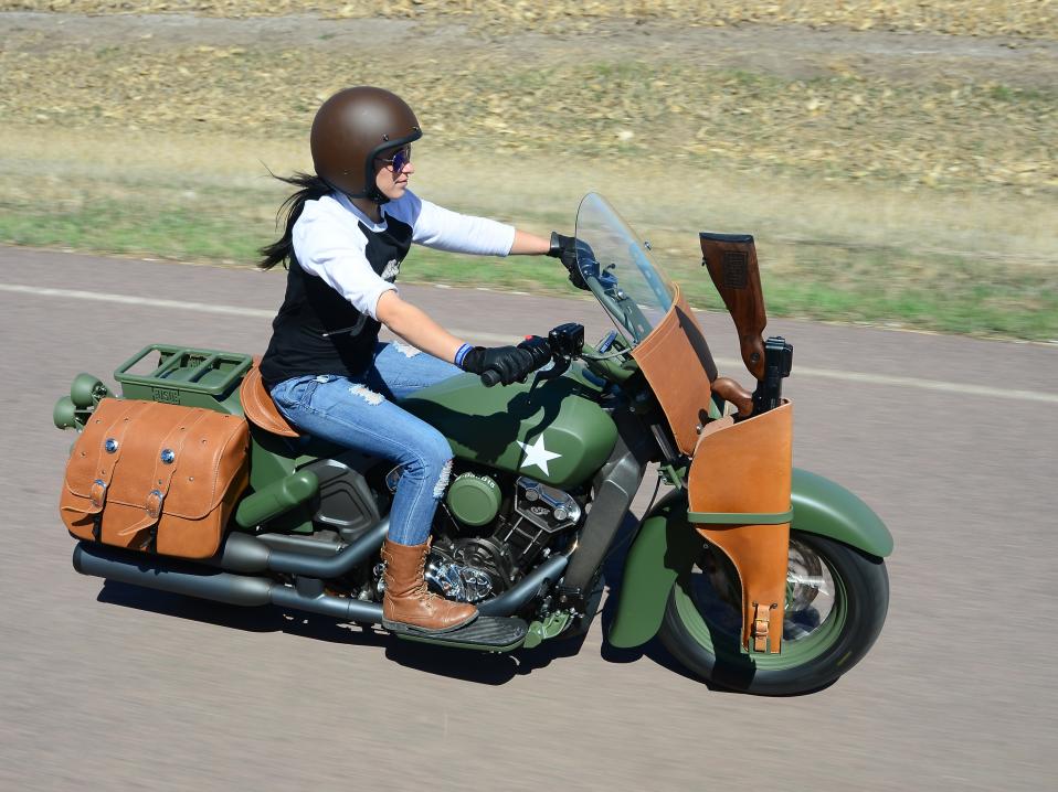 Custom Military Scout on rakennettu vuosimallin 2015 Scoutista ja maalattu mattavihreäksi. Perävalot ovat moderni kopio alkuperäisestä sotilastyylistä. Pyörässä on alkuperäiset pyörämallin nahkalaukut, mutta asekotelo on Mitchellin Boyds Gunstocksin, ja siihen on etsattu sekä USO:n että Indian Motorcyclesin logot.