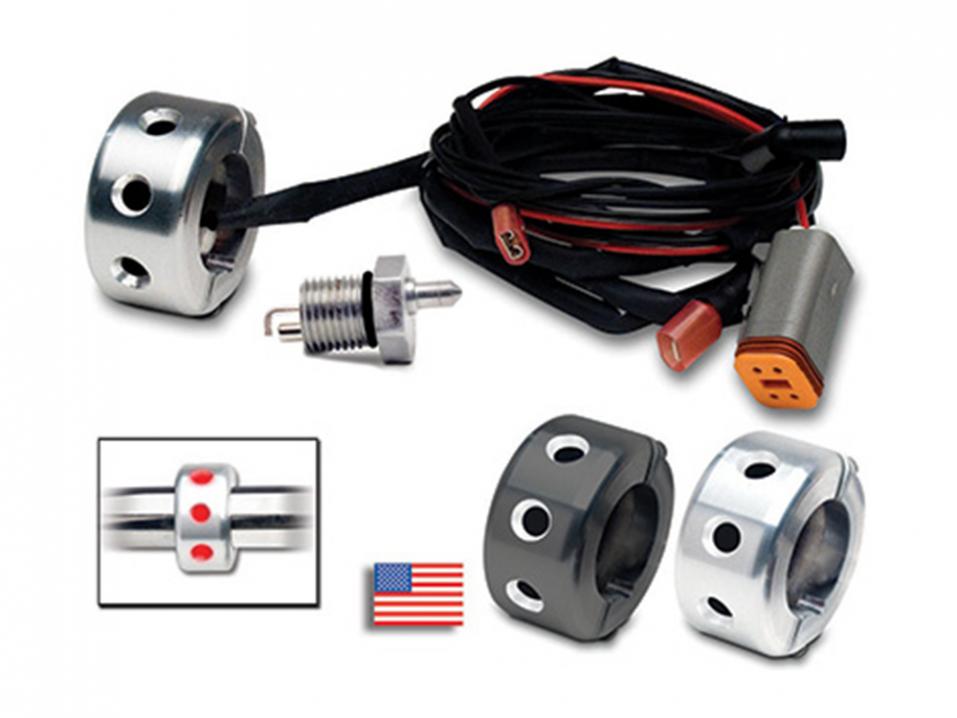 Järjestelmän mukana tulevat kaikki kytkentään tarvittavat kaapelit, erikoisvalmisteinen sensorilla varustettu öljyproppu sekä valintasi mukaan joko mustaksi anodisoitu tai kromattu ohjaustangon kiinnitys LED-valoille.