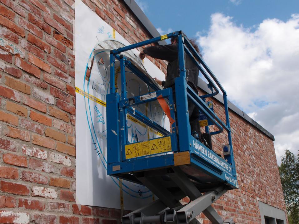 Lauantaina Moottoripyörämuseon pääsisäänkäynnin puolelle valmistui Hannisen taiteilemana museon virallinen logo ja sunnuntaina oli puolestaan vuorossa Ace Cornerin mustavalkoinen tuotemerkki.