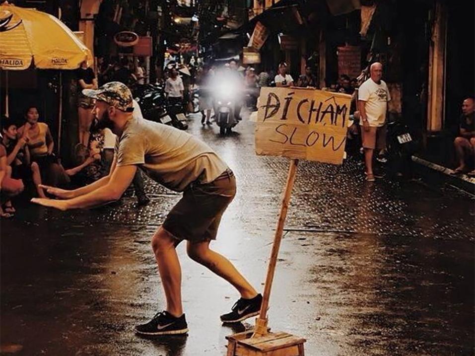 Vietnamilainen Thanh Nien News kertoi kesäkuun 13. päivänä eli viime lauantaina tapahtuneesta sattumuksesta. Saksalainen nuorimies, josta tiedetään ainoastaan etunimi Maxx oli kävelemässä Ta Hien -kadulla myrskyn jälkeen, ja huomattuaan liukkauden ryhtyi toimeen. Koska monikaan ei ymmärtänyt hänen käsimerkkejään, hän rakensi kyltin.