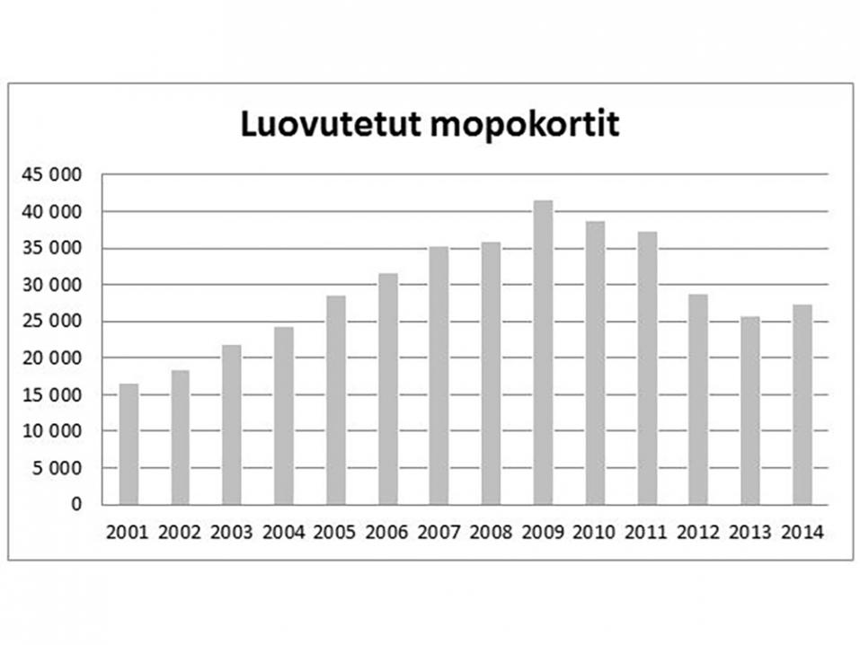 Tyttöjen osuus mopokortin suorittaneista on kasvanut vuosi vuodelta. Kun vuonna 2001 tyttöjen osuus oli 24 %, vuonna 2014 mopokortin suorittaneista oli tyttöjä jo 40 %.