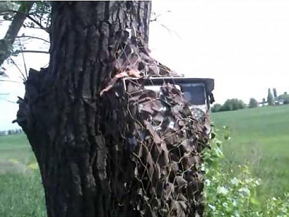 Naamioverkko ja puunrunko ovat varmaan jo tosi paha yhtälö, mutta eipä ohiajavasta ajoneuvosta kovin helposti havaitse tuota hedelmäkojun viereenkään piilotettua nopeustutkaa.