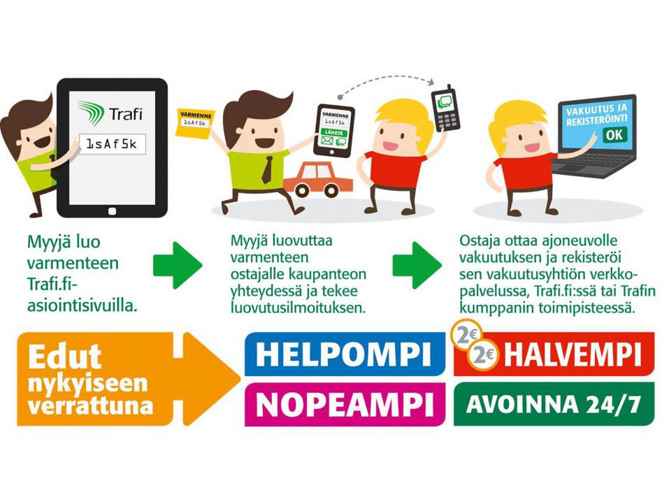 Ajoneuvon sähköisen varmenteen eli rekisteröintitodistuksen korvaavan turvakoodin ansiosta omistajan vaihdon rekisteröinnin yhteydessä ei tarvitse enää esittää mitään asiakirjoja. Käytännössä myyjä hakee Trafin sähköisen asionnin kautta ajoneuvolle varmenteen ja luovuttaa varmenteen ostajalle. Tämän jälkeen ostaja rekisteröi ajoneuvon sähköisessä palvelussa varmenteen avulla.