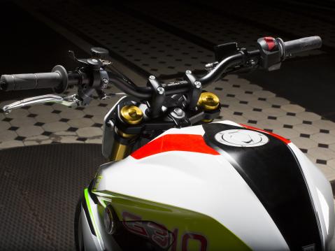 Matala etuosa ja nostettu peräpää lupaavat nopeita ja ketteriä suunnanmuutoksia yhtä hyvin kuin dynaamista ajoa. Kääntämällä sisäänottopuolta eteenpäin ja pakopuolta taaksepäin on ollut mahdollista sijoittaa äänenvaimennin pystyasentoon istuimen alle moottorin ja iskunvaimentimen väliin. Tällä tavoin äänenvaimennin on optimaalisesti suojassa ja eikä rajoita kuljettajan liikkumisen vapautta.