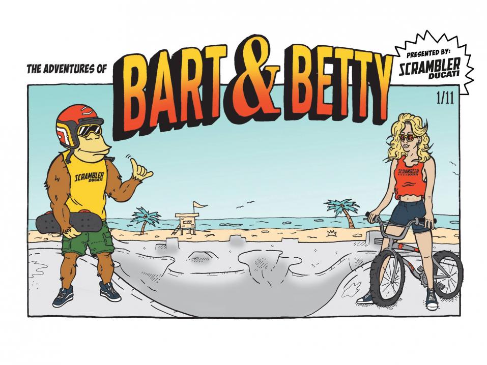 Sarjakuvakaksikko kulkee nimellä Bart & Betty, ja kuten huomaatte, avauskuvan ylänurkassa on Scrambler-logo. Betty on skeittaaja ja Bart harrastaa maastopyöräilyä. Luvassa on heidän seikkailujaan Ducatin Facebook-sivuilla.