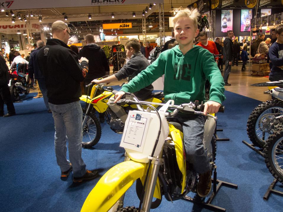 – Tämä on perinteinen jokavuotinen KMX - Kaarina Motocross ry:n reissu tänne MP-näyttelyyn. Meitä on bussilastillinen, josta muksuja on matkassa toistakymmentä, kertoo Miikkan isä Markus Palohuhta. – Itse ajan crossia ihan kuntoilumielessä ja keskimmäinen poikani on myös lajin parissa. Kyllä siinäkin on ihan riittävästi pyörien pesemistä ja huoltamista, ajon jälkeen, Markus nauraa.