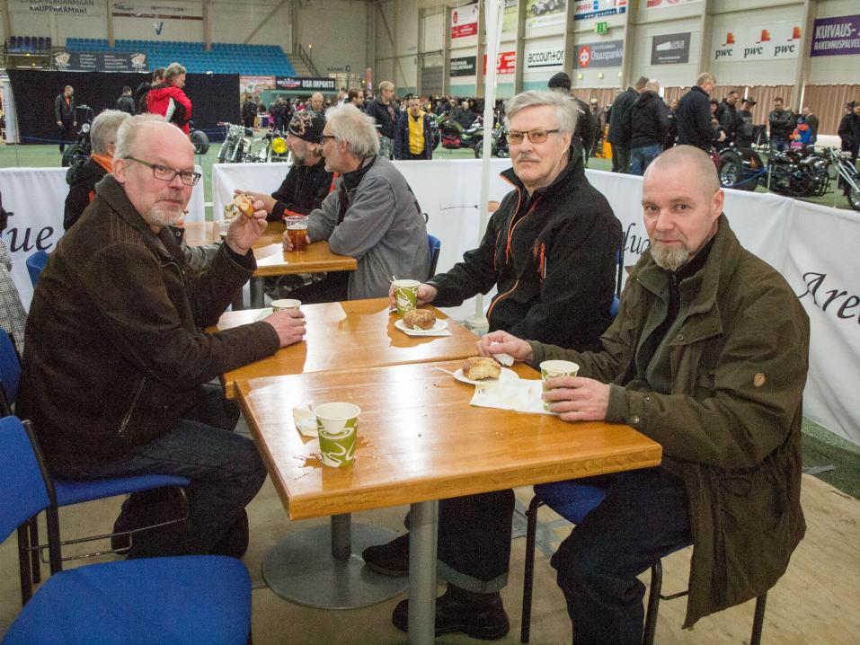 Tällä kertaa kukaan herroista ei ollut tullut paikalle moottoripyörällä, mutta kaksi vuotta sitten alajärveläinen Raimo Peltomäki tuli Bikeshow'hun moottoripyörällään.