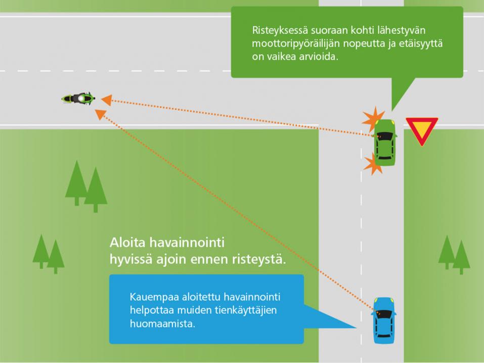 "Moottoripyörä on kapeampi ja huomattavasti pienempi ajoneuvo kuin henkilöauto. Talven aikana kaksipyöräisiä on näkynyt tien päällä vain harvakseltaan, joten oman havainnoinnin uudelleen totuttaminen moottoripyörään vaatii valpastumista. Mitä pienempi lähestyvä ajoneuvo on, sitä vaikeammaksi etäisyyden ja nopeudenarviointi muuttuu. Pääsääntöisesti etäisyydet yliarvioidaan ja nopeudet aliarvioidaan," todetaan Liikenneturvan tiedotteessa.