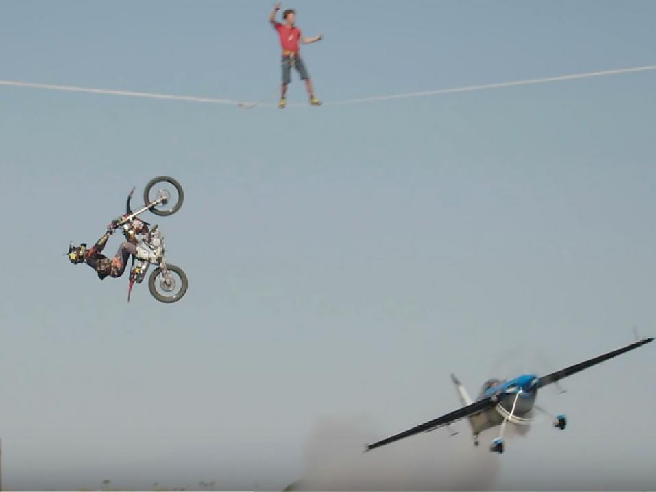 Andy Lewis ylittää aluetta köyttään pitkin, ja pysähtyy katsomaan, kun Jimmy Fizpatrick tekee voltin yli Melissa Andrzejevskin lentämän lentokoneen. Kone lentää myös Lewisin köyden ali.