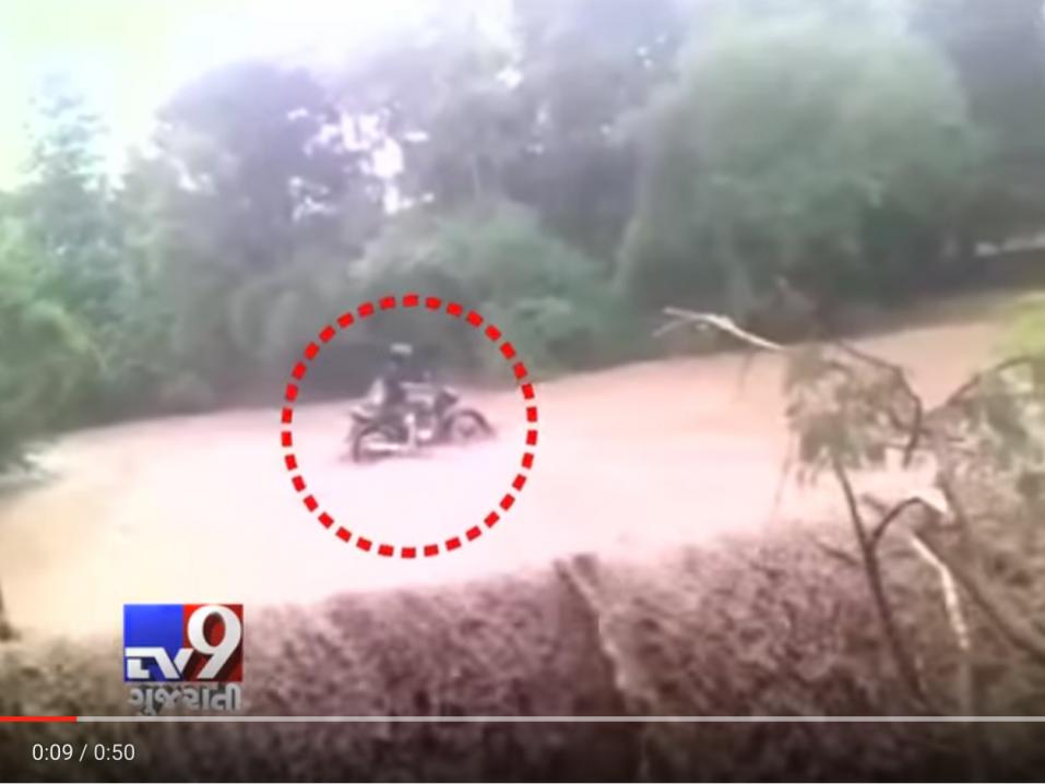 Heti videon alkutahdeilta kasvaa epäilys, että huonostihan tuossa käy. Virta on todella voimakas ja motoristi ajautuu pyörineen virran mukana ties mihin asti. Tapahtumapaikka on Intiassa Kaladhungissa Uttarakhandin osavaltiossa. Video on Tv9 Gujaratin käsialaa.
