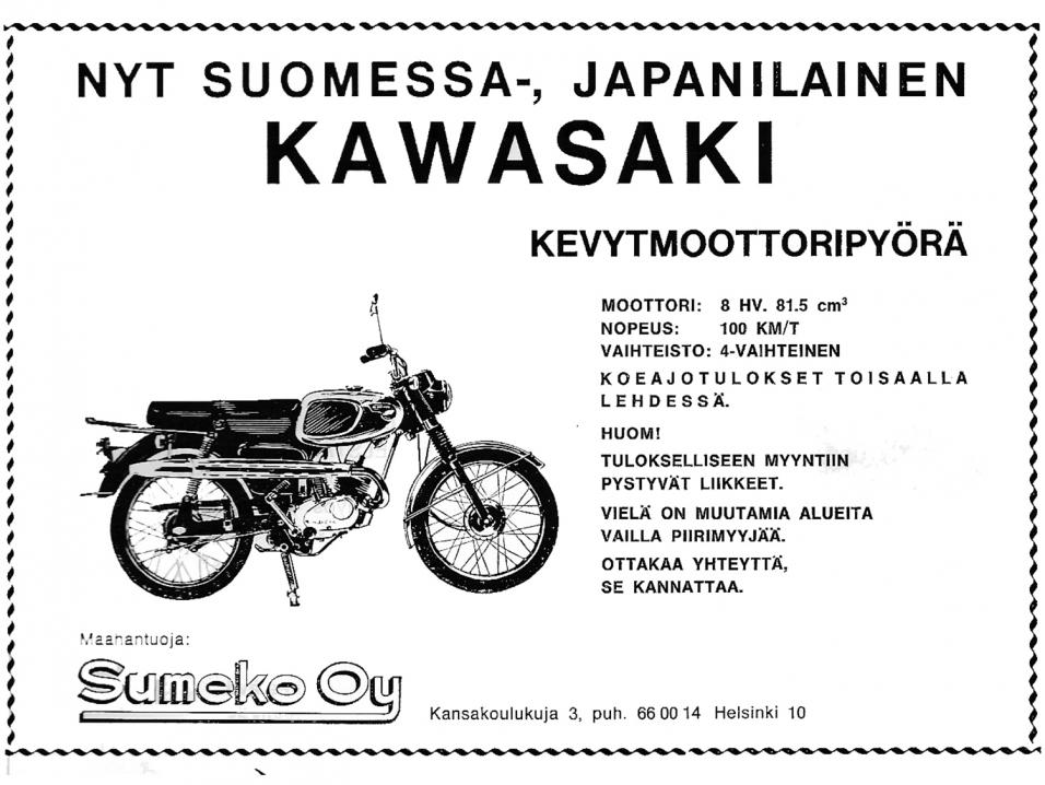 Sumeko Oy oli yksi ensimmäisistä Euroopan Kawasaki‐maahantuojista. Pohjoismaissa Carl Andersen Tanskan Odenseessä oli ”se ensimmäinen”. Mainittakoon, että Englannissa maahantuonti alkoi 1967, Ranskassa loppuvuodesta 1967, Saksassa alkuvuodesta 1968 ja Italiassa elokuussa 1969.