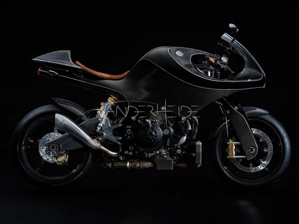 VanderHeiden hiilikuiturunkoinen Aprilia RSV:n V4-moottorilla varustettu Art Deco -tyylinen pyörä on melkoinen näky. Ja varmaan myös tykki, kun siitä miedoimmillaankin irtoaa yli 200 hv.